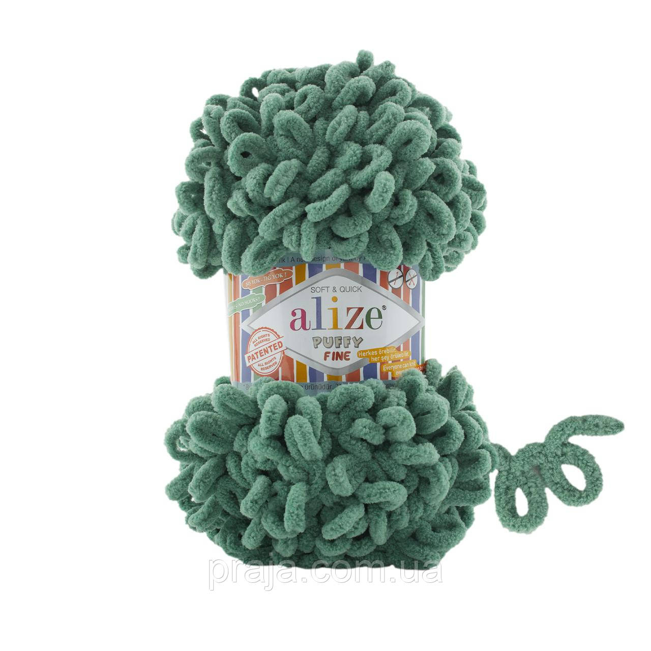 Пряжа Alize Puffy Fine - плюшева дитяча пряжа з м'якою текстурою для в'язання руками без спиць. Цікава велюрова букльована нитка Алізе Пуффі Файн складається з маленьких петельок, які при в'язанні руками переплітаються в полотно.
